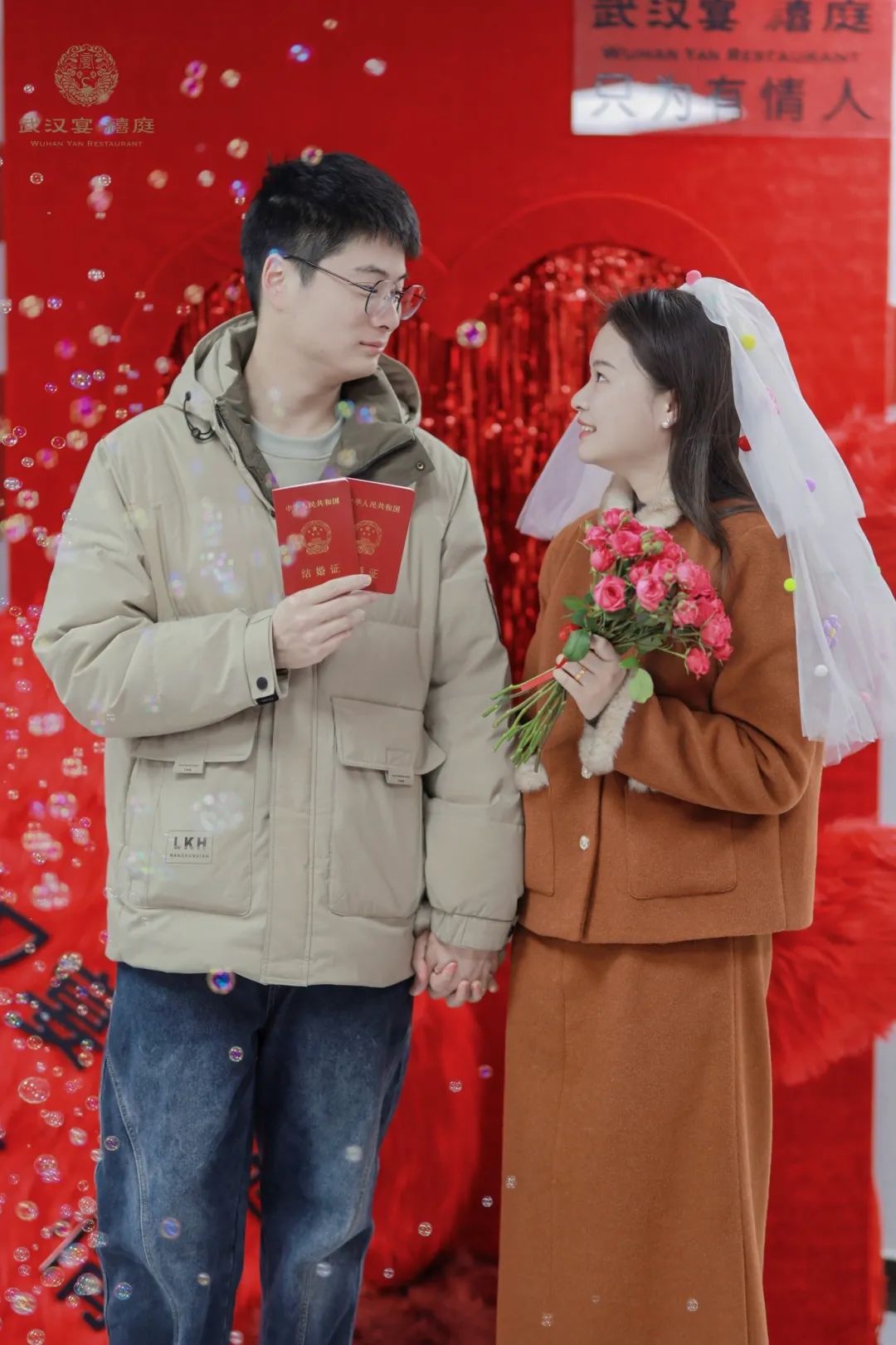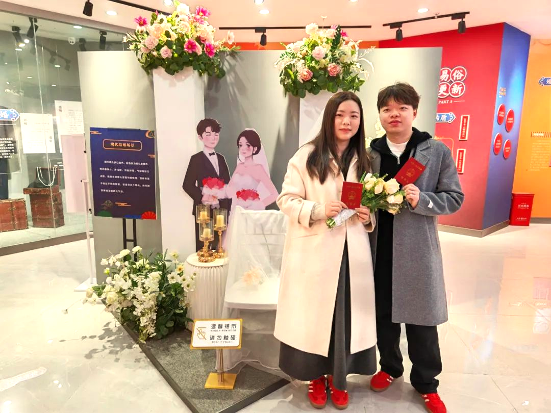 “听说今天是个好日子,寓意着‘有情人终成眷属’,而且正好是我们恋爱一周年的纪念日,所以我们特意请假过来领证。这里的氛围布置得特别好,仪式感十足!”黄女士和殷先生手挽着手,在每个打卡区都留下了甜蜜的合影。
