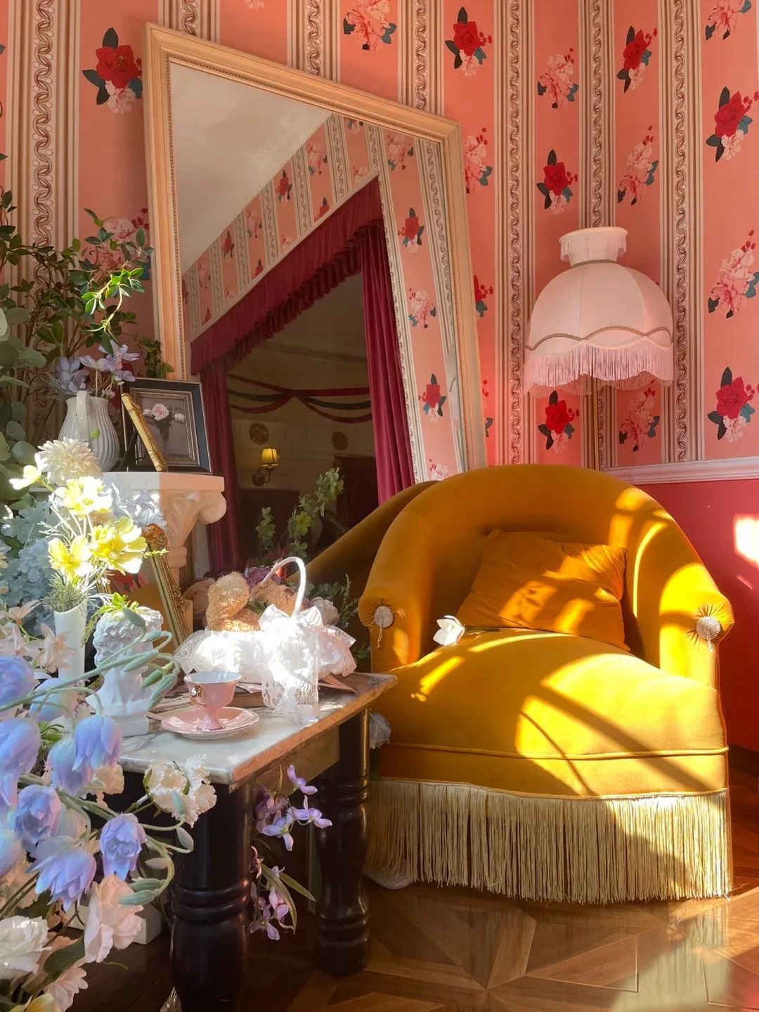 色彩斑斓的花卉在微风中轻轻摇曳,与复古的室内陈设相映成趣。