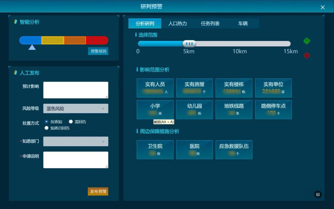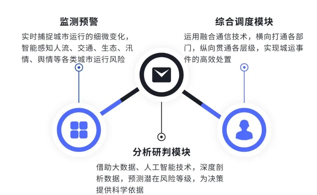 在此基础上,平台构建了监测预警、分析研判、综合调度三大核心功能模块。