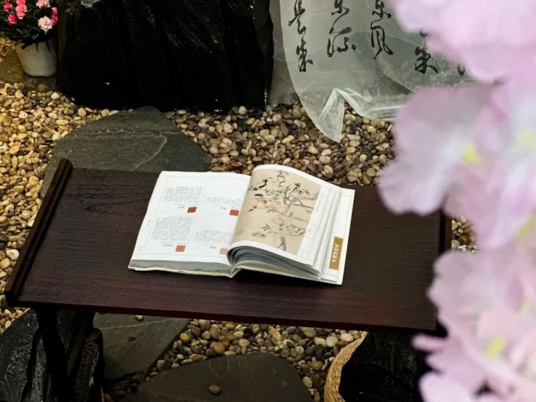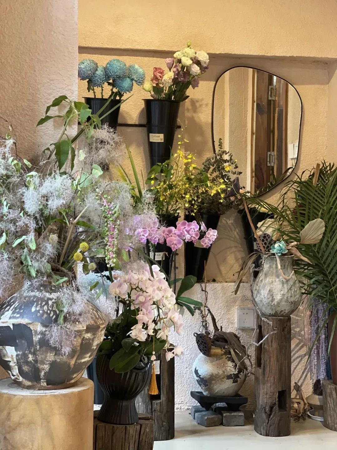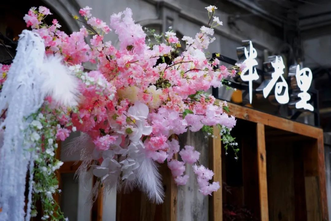 露天的庭院里樱花枝颤,店内整面鲜花墙与季节同步更新,角落里的禅意插花抚平倦意。