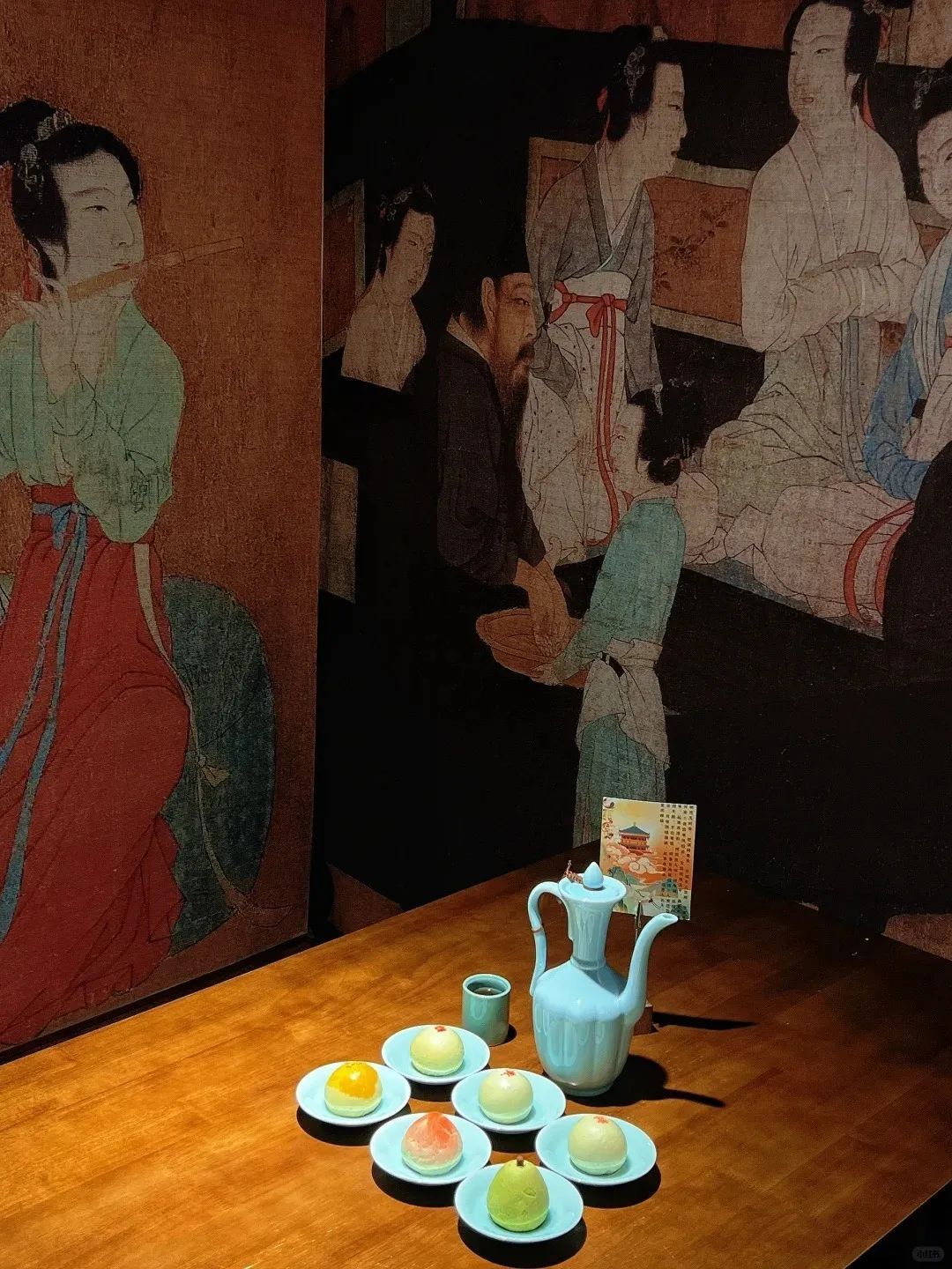 走进鲂一茶点,每个角落都是电影场景,仿古唐风壁画细腻生动,轩窗半掩,透进斑驳光影,古色古香中透着几分静谧与雅致。