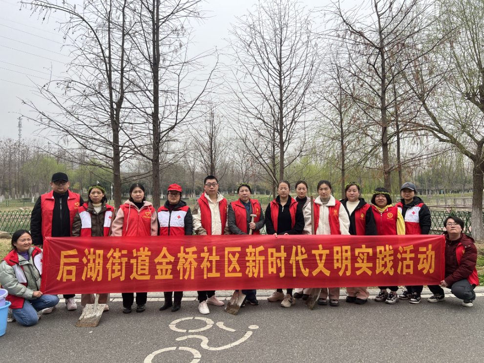 后湖街道金桥社区新时代文明实践站开展“守护绿色,共树希望”植树节活动。社区党员与红十字会志愿者在府河郊野公园为此前认领的水杉树取水浇灌、清理杂草,践行绿色发展理念。