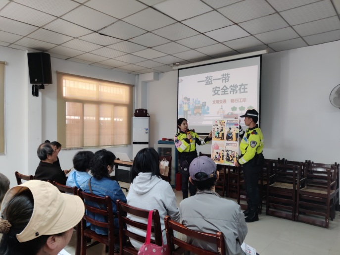 区委宣传部联合区交通大队、西马街道在光荣坊社区新时代文明实践站开展“文明交通‘一盔一带 安全常在’文明社区行”活动。用拉家常的方式为群众讲述道路交通安全知识,引导居民遵守交通法规。