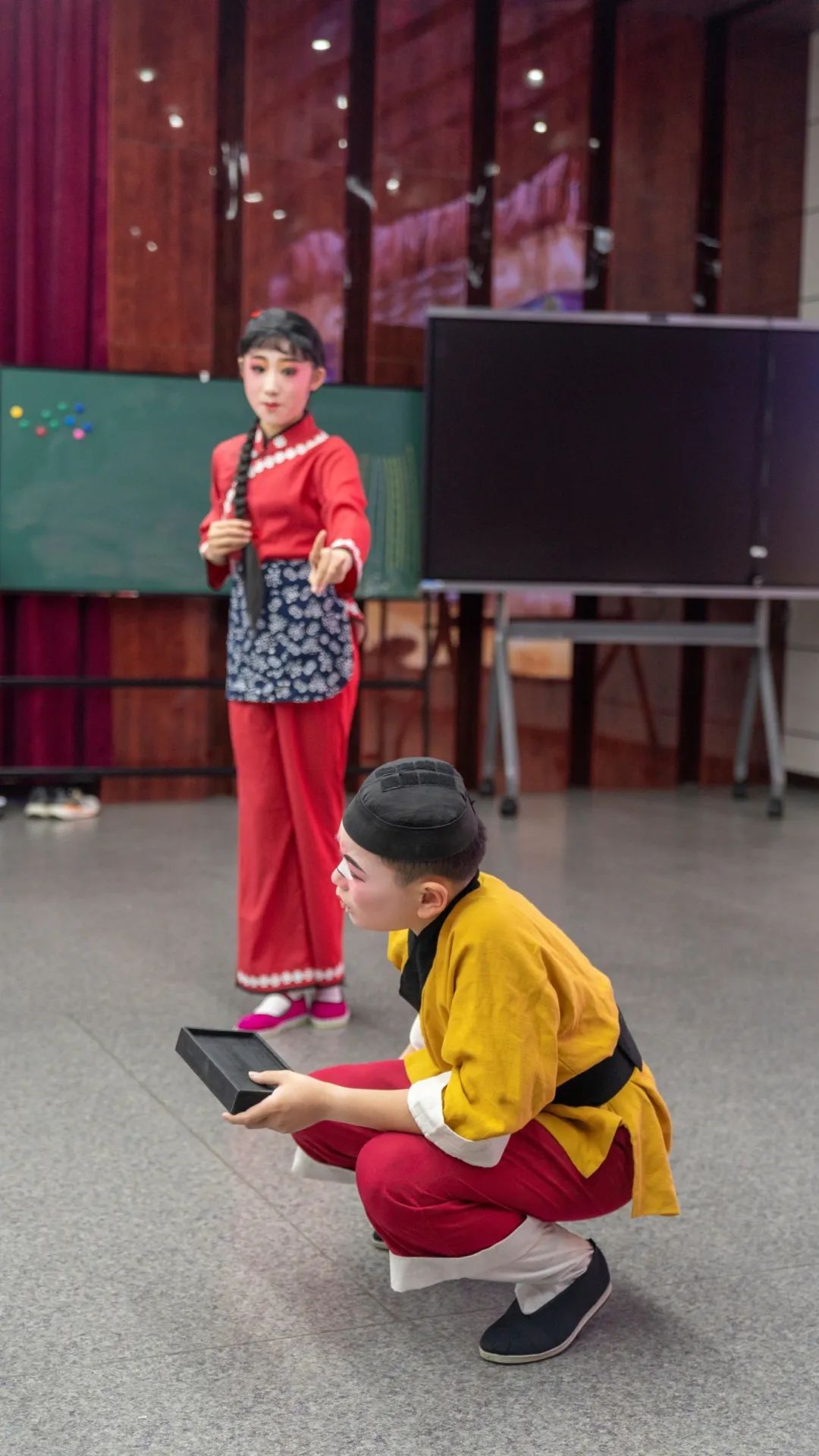 在戏曲教室里,五年级学生龚泽轩身着黄色戏服,演绎楚剧《劝学》中的丑角角色。这个性格活泼的男孩坦言:“学戏让我学会了坚持,也爱上了中华文化的韵味。”黄梅戏《新五女拜寿》的创编也让学生初次触摸传统艺术的生命力。