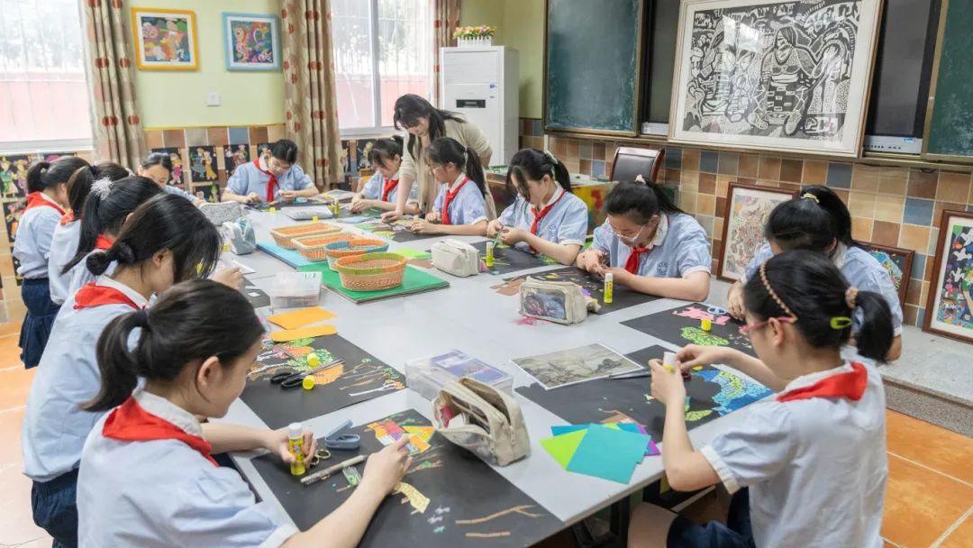 目前,这门特色课程已惠及上千名学生。学校还将点彩贴画与德育结合,引导学生用作品讲述红色故事,师生共同创造的系列作品获评多项美育创新案例。