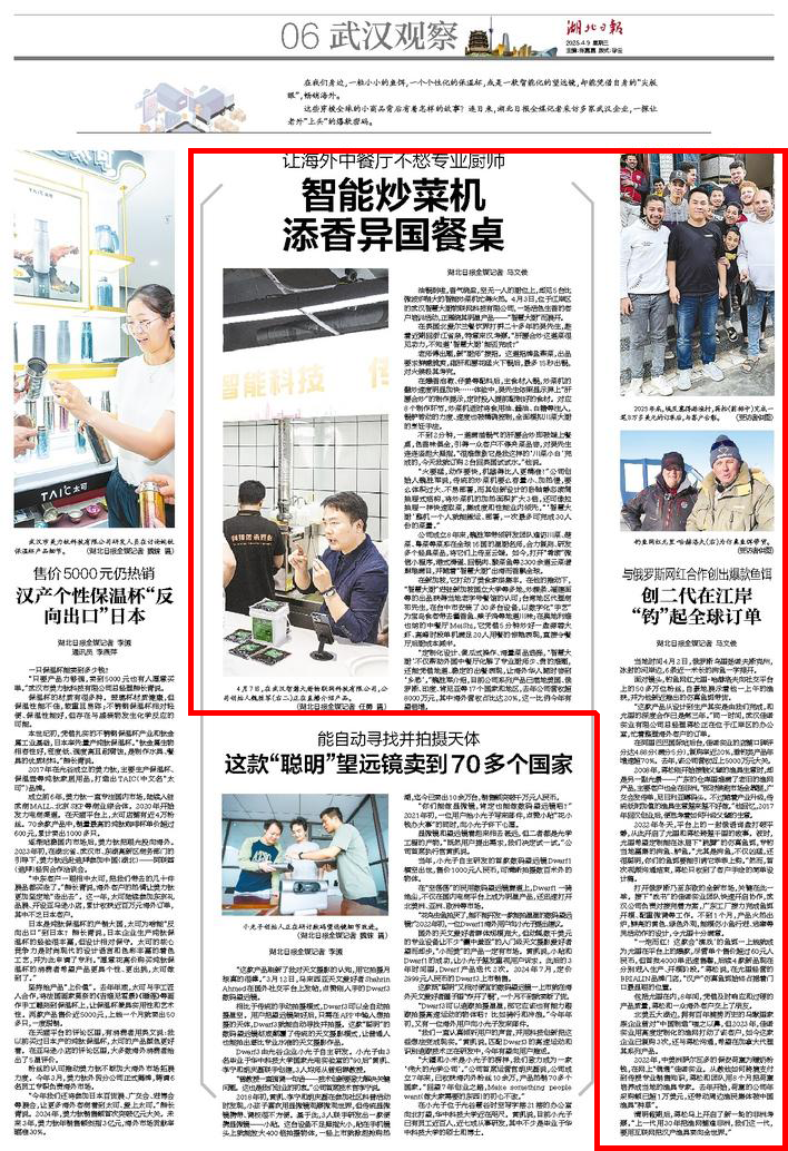 “定制化设计、傻瓜式操作、海量菜品选择,‘智慧大厨’不仅帮助外国中餐厅化解了专业厨师少、贵的难题,还能凭借地道、稳定的出餐表现,让海外华人随时尝到‘乡愁’。”该创始人介绍,目前公司系列产品已落地17个国家和地区,去年公司营收超8000万元,其中海外营收占比达20%,这一比例今年有望倍增。