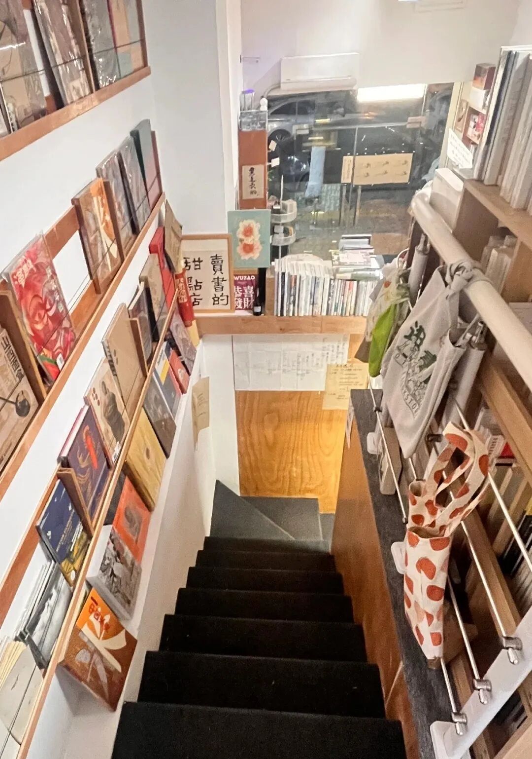 楼梯旁的墙壁也被精心布置,每一处细节都透露着店主对这家书店的用心。
