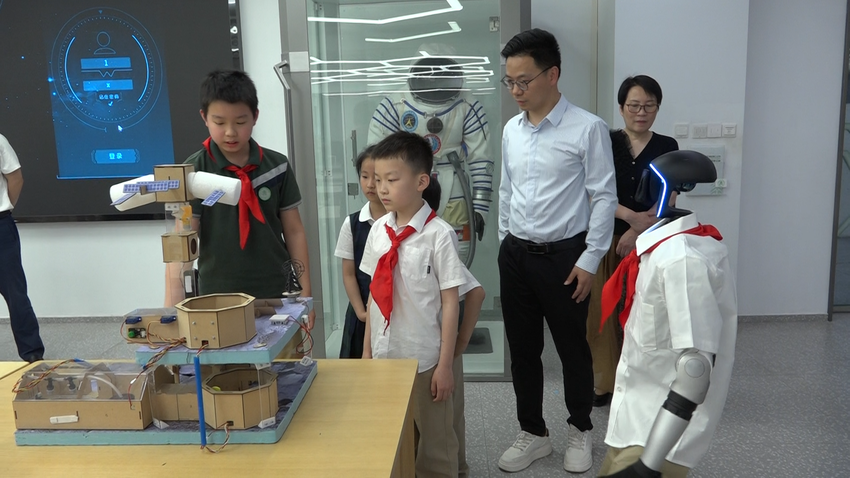 在二楼智创空间,小智与学校科创团队展开对话,详细介绍航天航空实验室、人工智能教室等特色空间,并分享学校在国家级科创赛事中斩获的16项荣誉。学生王俊乔展示“月球溶洞模拟基地”作品。