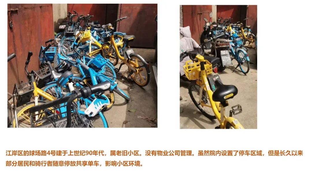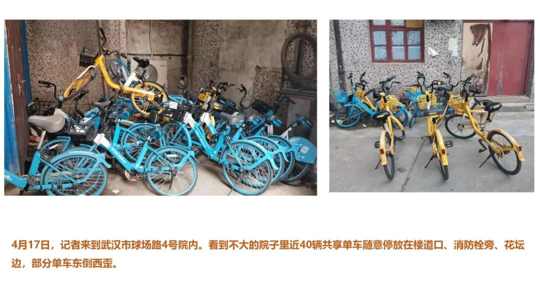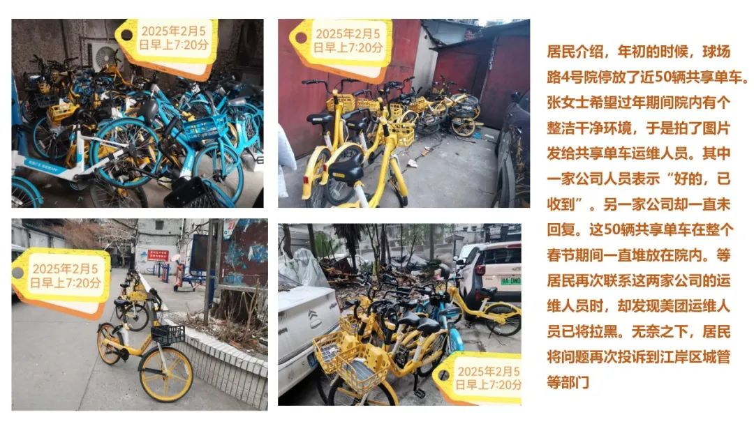位于江岸区的球场路4号建于上世纪90年代,属老旧小区。没有物业公司管理。虽然院内设置了停车区域,但是部分居民和骑行者随意停放共享单车,影响小区环境。居民张女士曾与共享单车企业运维人员取得联系进行清理,但问题仍未得到解决。
