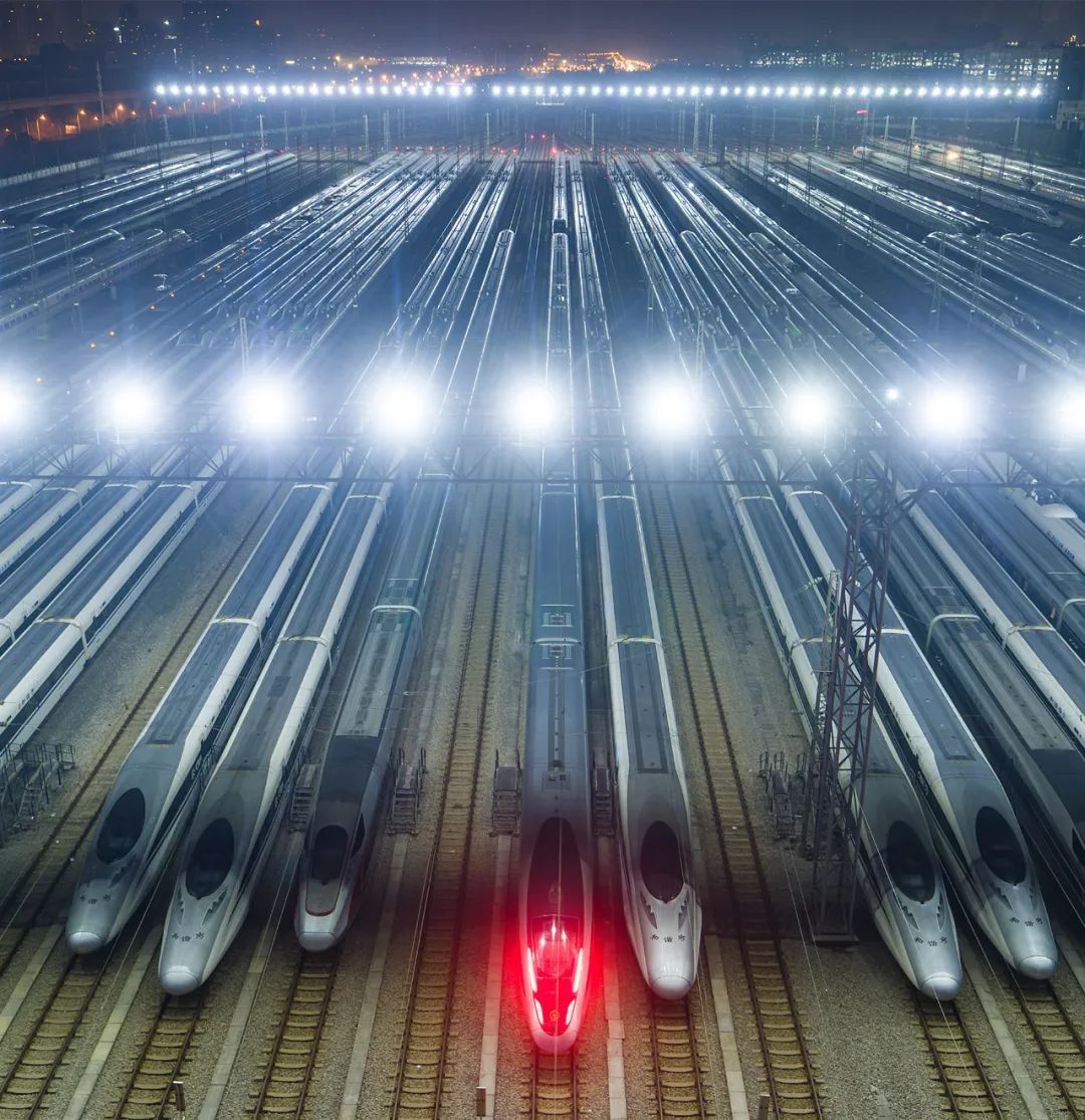 在武汉动车段的存车线上,一列列完成检修的动车组集结完毕,犹如“陆地航母”一般,蓄势待发。(湖北日报全媒记者 任勇 摄)