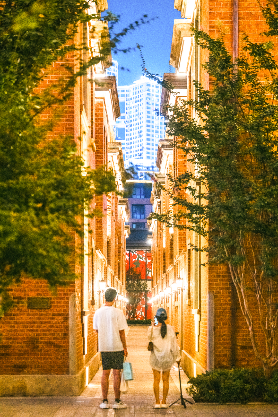 暖黄灯光浸染砖墙的时刻,街区又化作流动的盛宴。约三五好友在梧桐光影间小酌,或踏着青石板循迹百年建筑群,晚风会将历史的絮语轻轻送至耳畔。