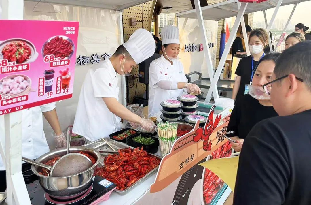今年文旅商融合再升级,多家本土餐饮品牌与游船企业碰撞出新火花。靓靓蒸虾与古琴号游船在“五一”期间合作推出“琴鸣夏夜·虾宴江城”美食市集,在甲板上的靓靓摊位下单,就能品尝到地道的汉派卤虾,还有凉面、樱花糕等。5月1日当晚,800人登船看夜景、剥虾肉,创下古琴号自运营以来的客流纪录。肥肥虾庄与长江荣耀游船首次破圈联动,将美食动线与城市漫游有机结合。