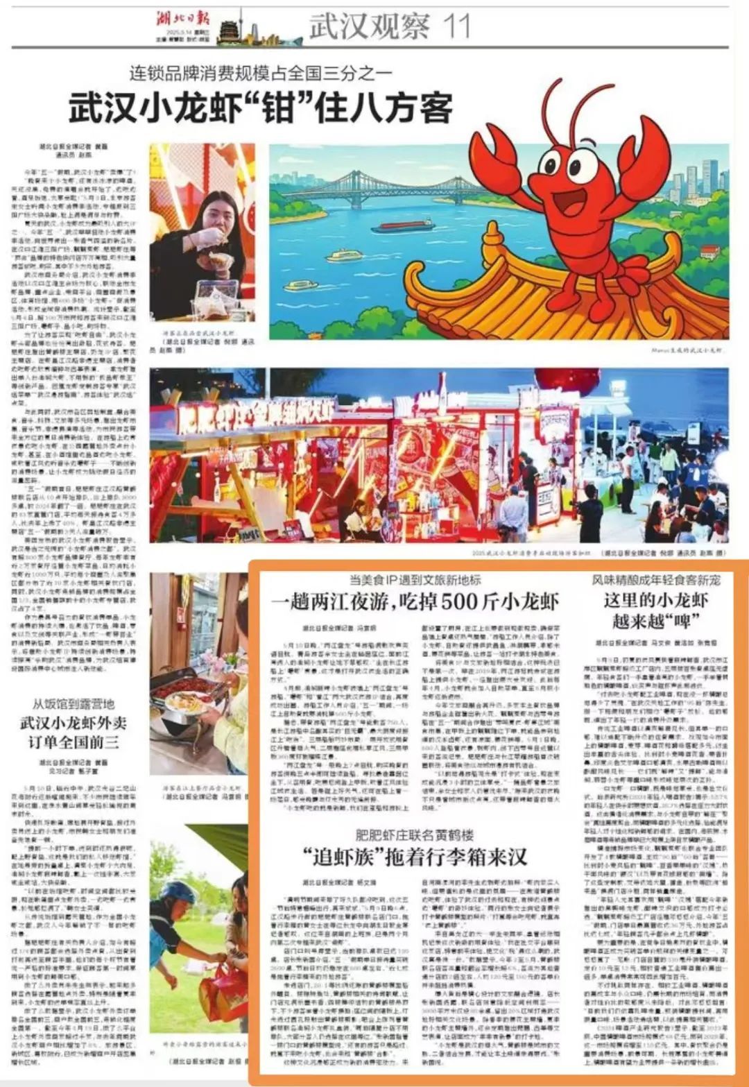 今日《湖北日报》武汉观察报道武汉小龙虾“钳”住八方来客,展示江岸小龙虾消费市场持续火爆。