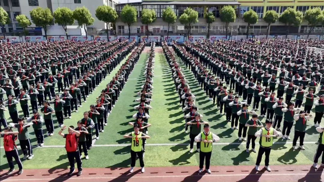 在武汉市汉铁初级中学,千余名师生伴随着悠扬的民族音乐,整齐划一地演练着传统养生功法八段锦。