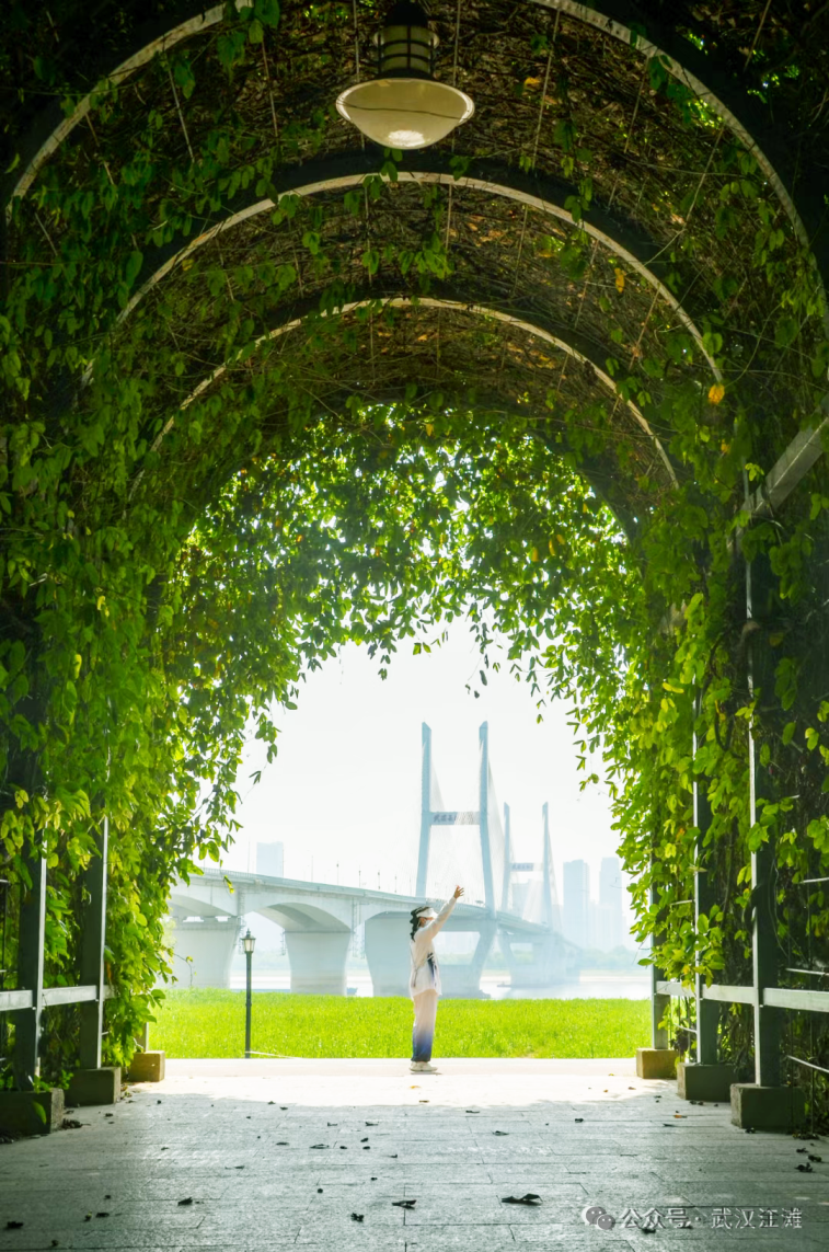 手机地图导航至“藤树牵花”,映入眼帘的是几条绿藤长廊,这里是小红书爆火的江滩必拍机位。