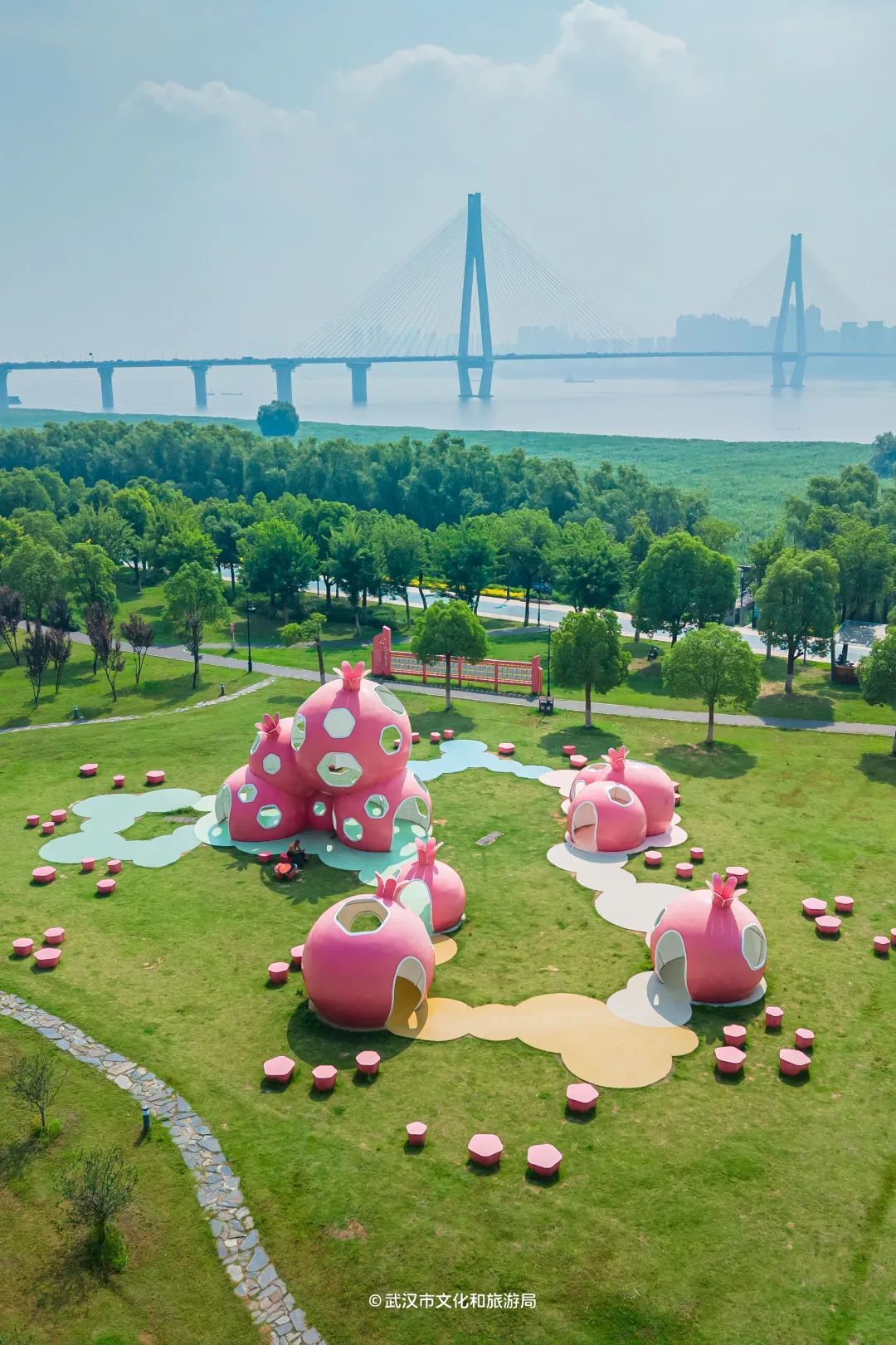该主题公园占地面积约1.7万平方米,红色的石榴装置与江滩美景相得益彰,适合亲子家庭遛娃和打卡拍照。