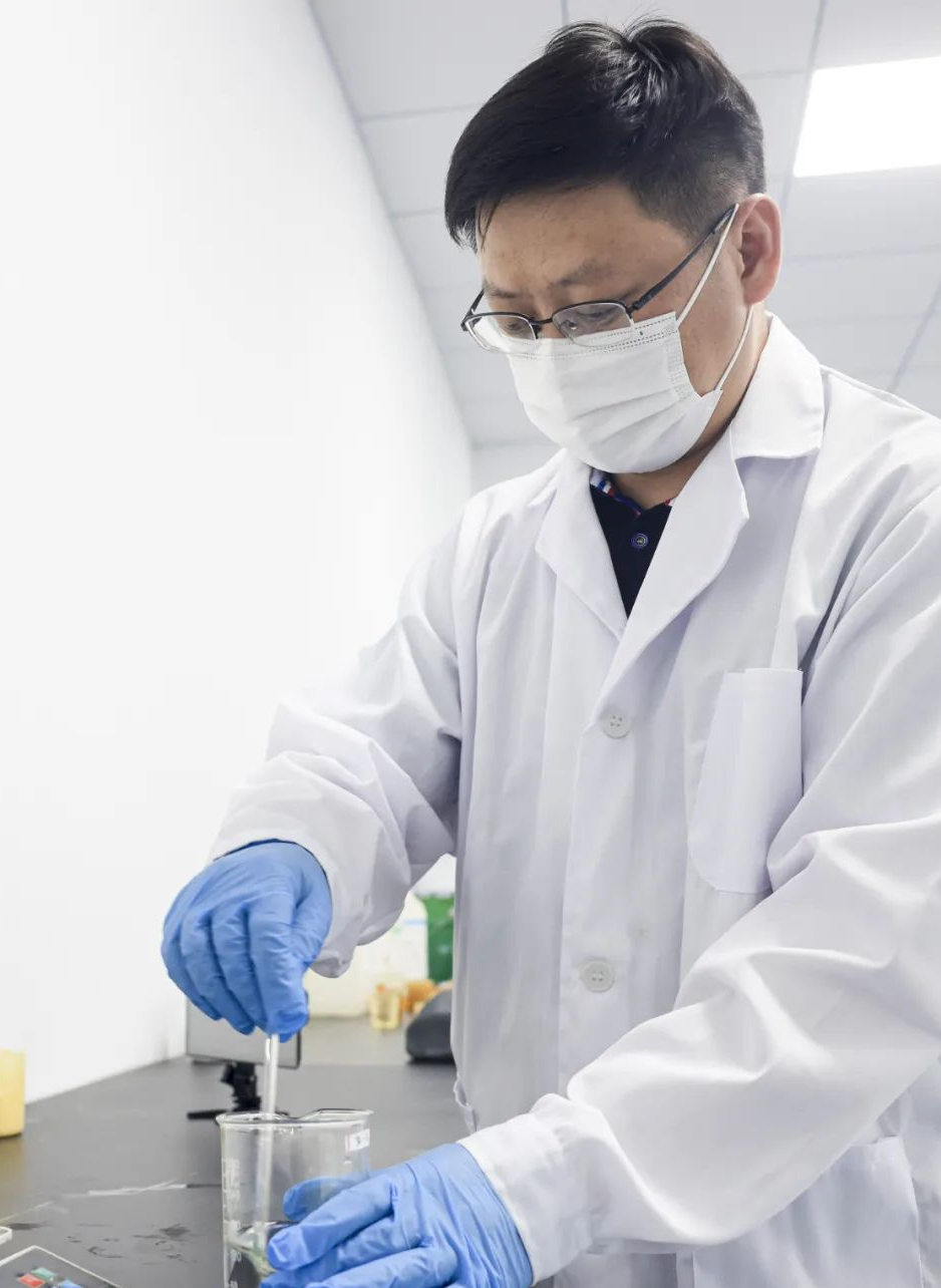 ▍ 实验室中,迈郝特市场研发总监汪源用两种不同的原料调制的“隧道胶水”刚性环氧树脂