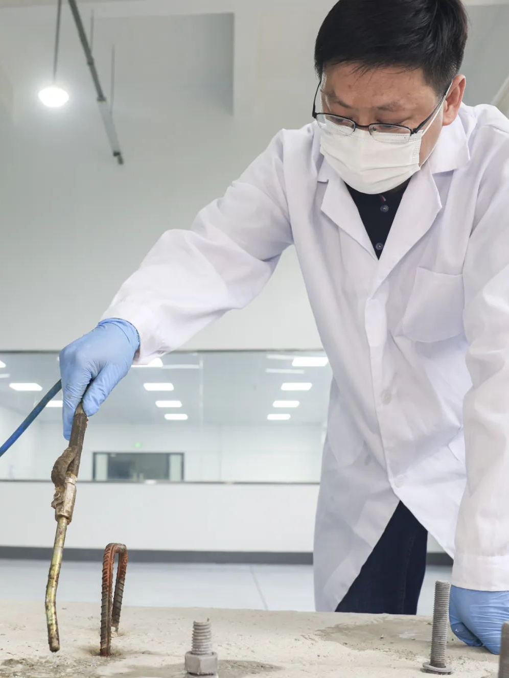 ▍ 实验室中汪源将调制好的“隧道胶水”刚性环氧树脂,注入混凝土裂缝中