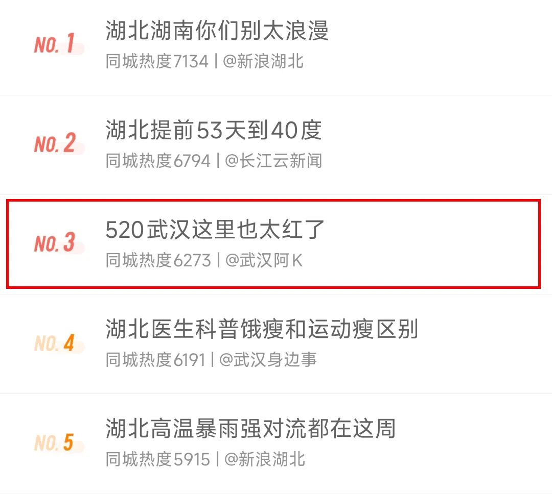 ▎#520武汉这里也太红了#登上微博同城热搜榜第三