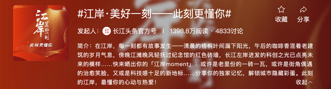 你与“美好江岸”还有哪些“美好一刻”?快来参加长江头条话题#江岸·美好一刻——此刻更懂你#或微博话题#我的江岸美好一刻#,分享你的独家记忆,此刻的江岸,最懂你的心动与热爱!