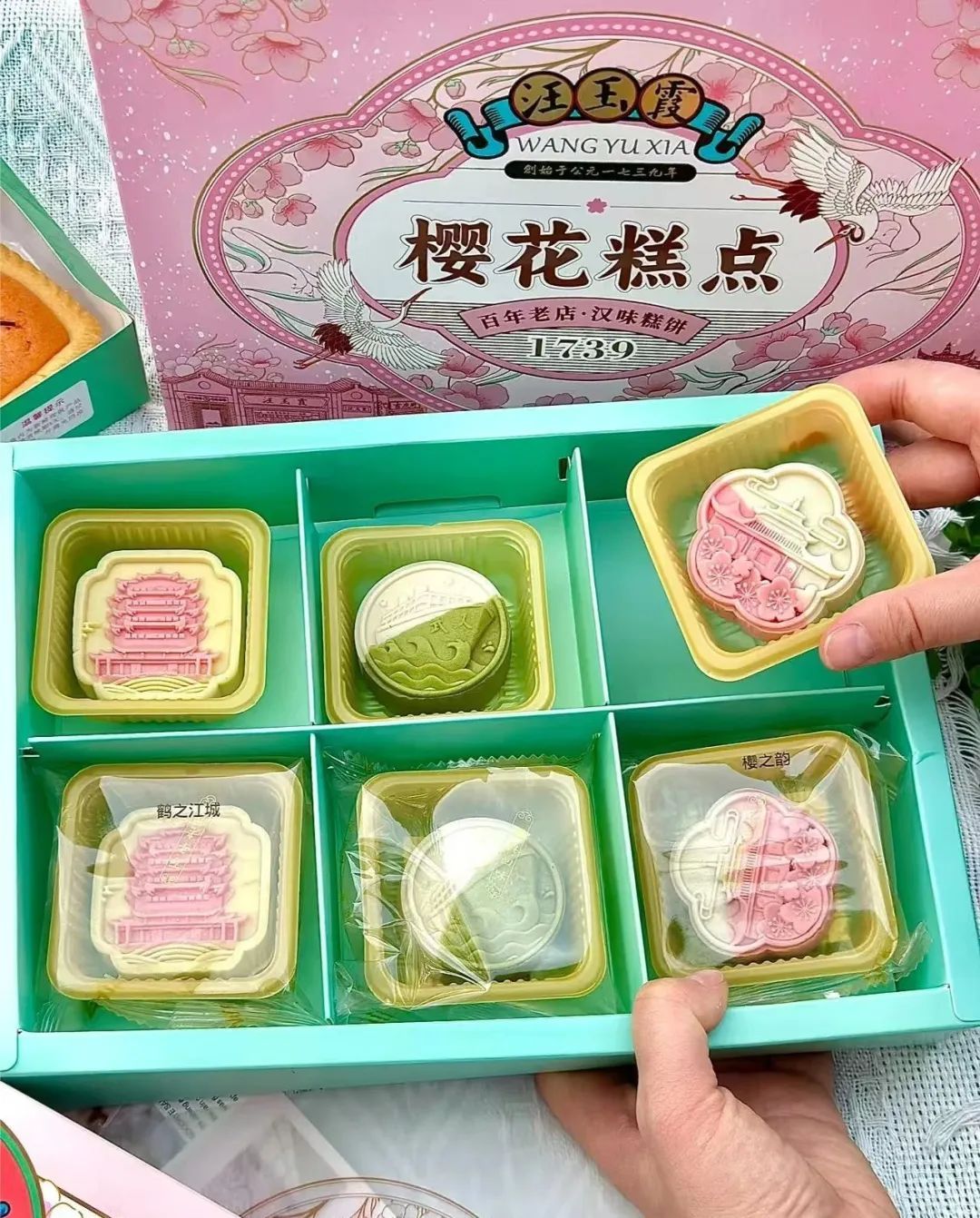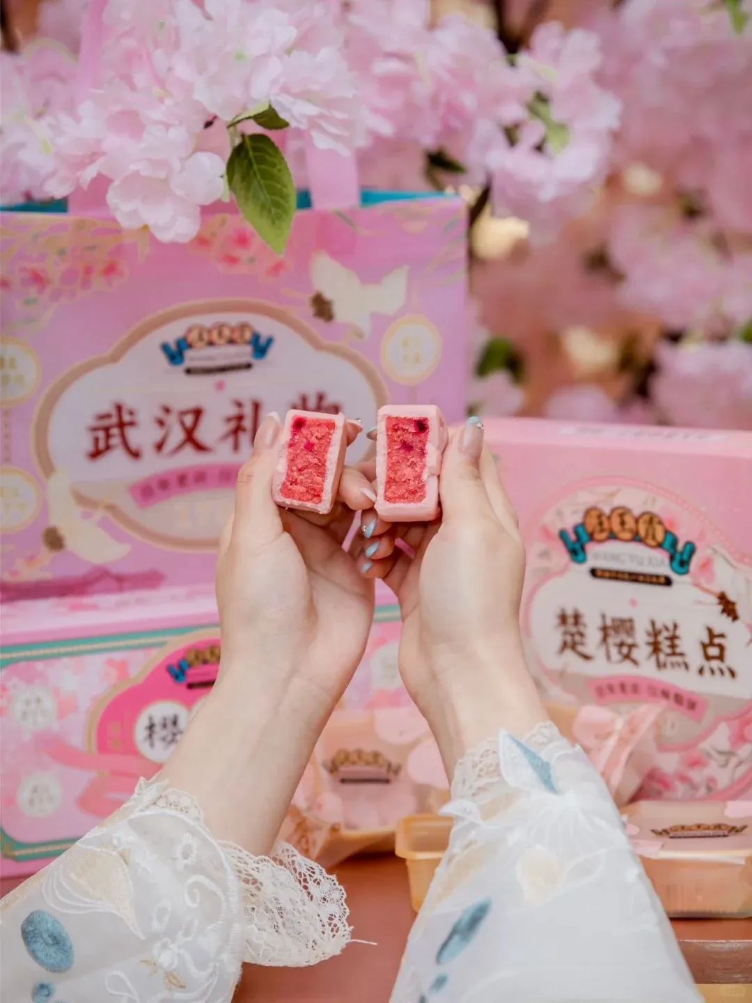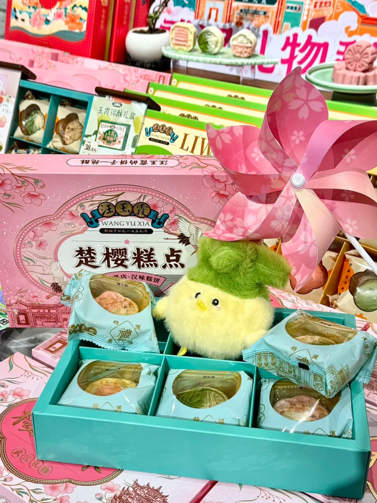 汪玉霞借着武汉樱花季的热潮,将关山樱花融入到了糕点中,“真材实料”地打造了樱花系列礼盒。