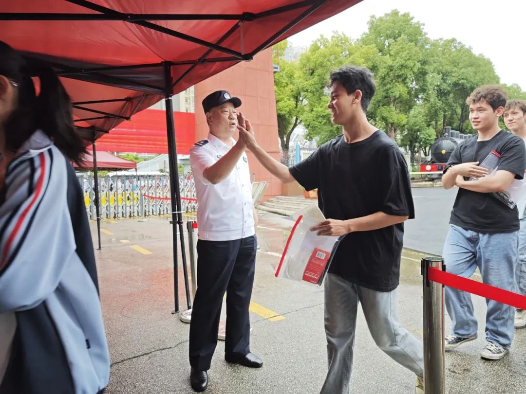 带着笑容与考生们击掌