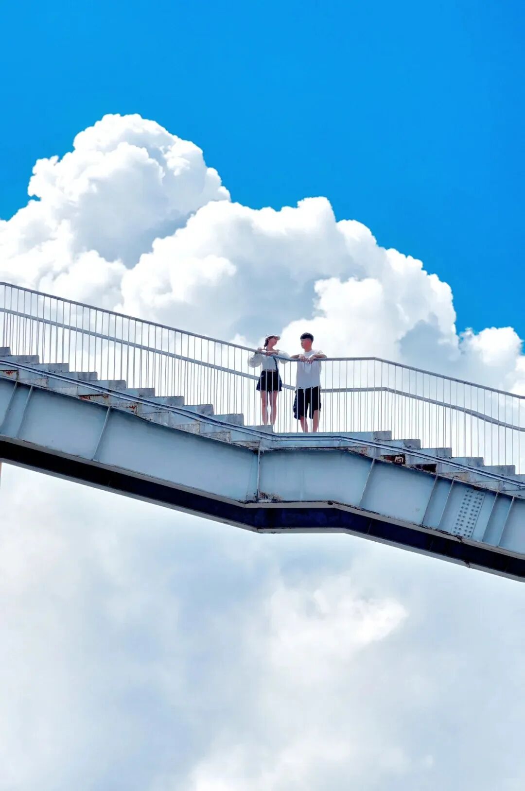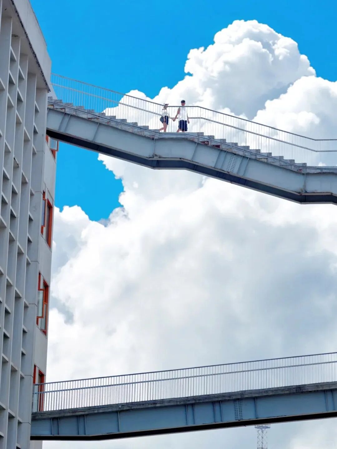 几何线条切割出澄净的蓝,工业风连廊悬浮在云朵之间——这座由老厂房改造的工业风创意园,简直是现实版的宫崎骏动画场。
