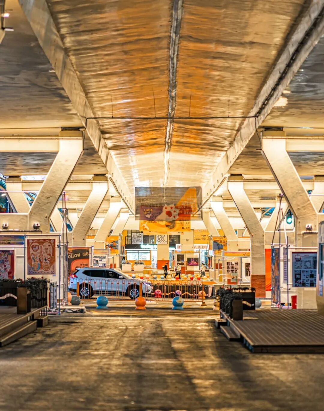 这里是黄浦大街立交桥下空间综合利用项目的一部分,桥下不时有市集或展览。打卡之后可步行前往武汉天地商圈,一站式享潮流生活。