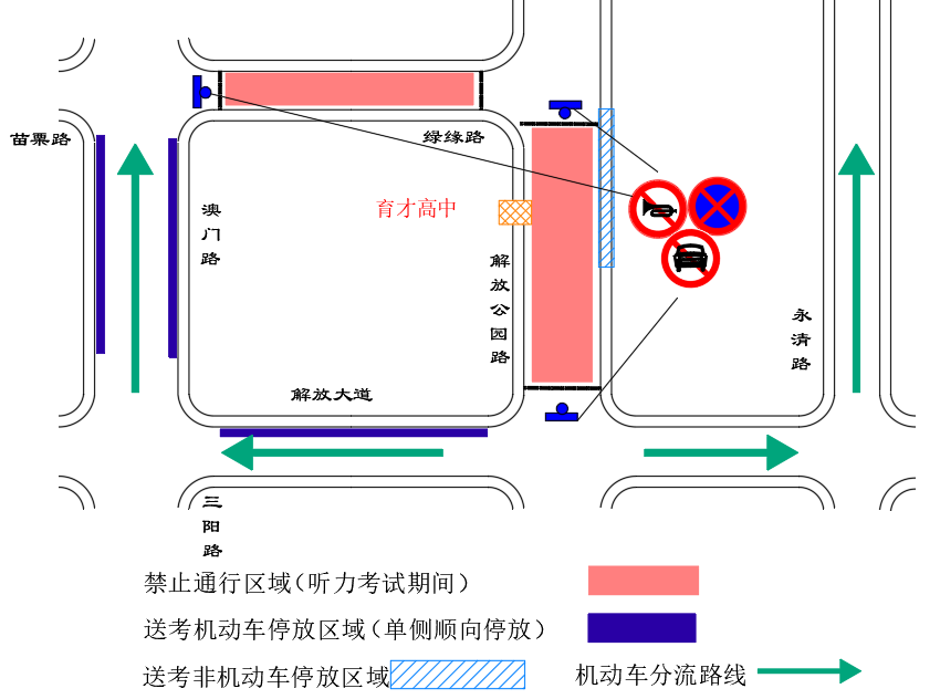 ⛔ 考试期间管制路段:解放公园路(绿缘路至解放大道)、绿缘路(澳门路至解放公园路)听力期间禁止通行,建议绕行永清路、澳门路、解放大道。绿缘路澳门路口禁停、禁鸣、禁行。