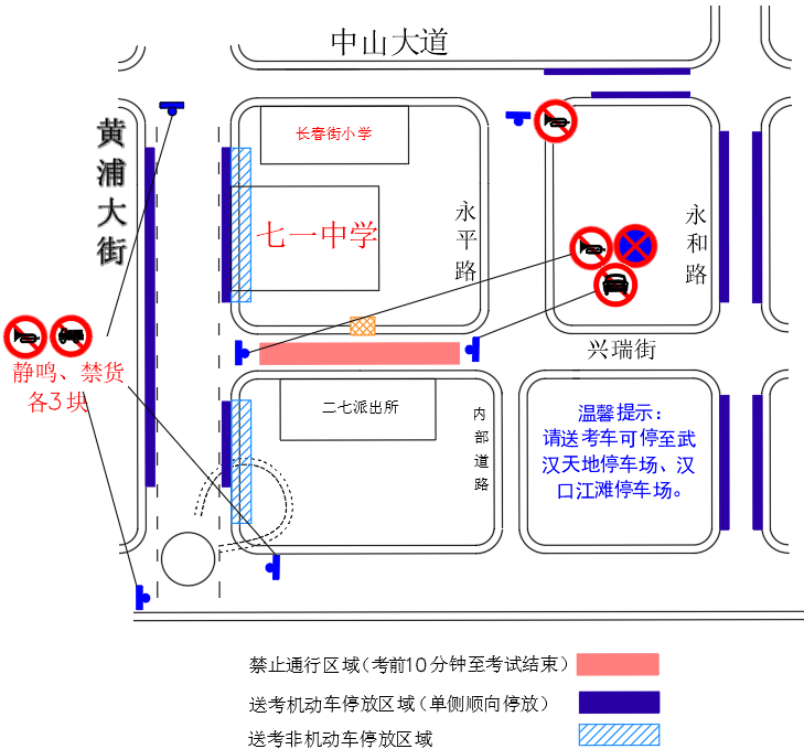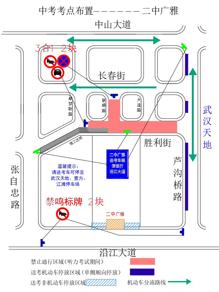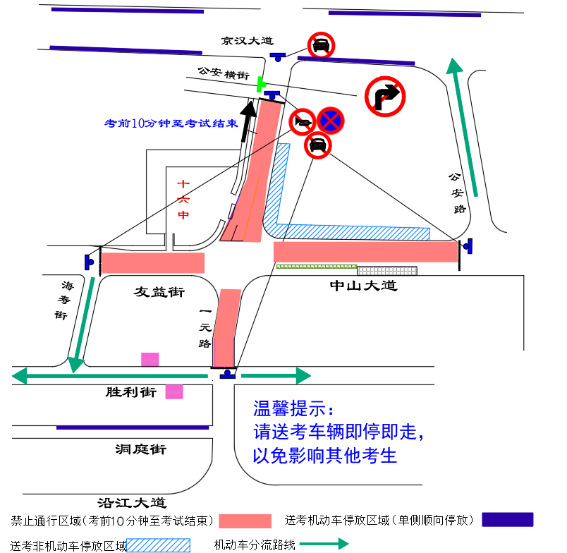 ⛔ 考试期间管制路段:一元路(公安横街至胜利街)、中山大道(海寿街至公安路)每日考前十分钟至考试结束禁止通行,建议绕行京汉大道、沿江大道、胜利街、公安路。一元路胜利街路口、中山大道海寿街口禁停、禁鸣、禁行。