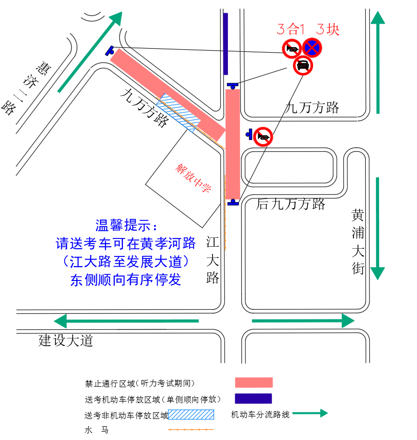 ⛔ 考试期间管制路段:江大路(后九万方路至道达尔加油站)、九万方路(惠济二路至江大路)听力考试期间禁止通行,建议绕行惠济二路、建设大道、黄浦大街。惠济二路九万方路口、后九万方路江大路口、江大路道达尔加油站门口禁停、禁鸣、禁行。