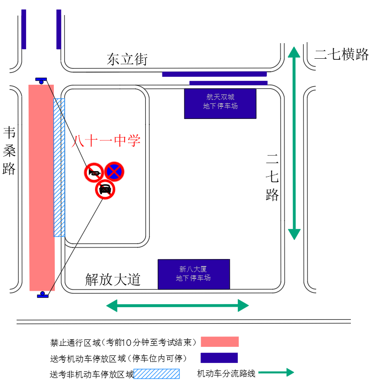 ⛔ 考试期间管制路段:韦桑路(东立路至解放大道)考前10分钟至考试结束禁止通行,建议绕行解放大道、二七路。韦桑路的东立街和解放大道路口禁停、禁鸣、禁行。