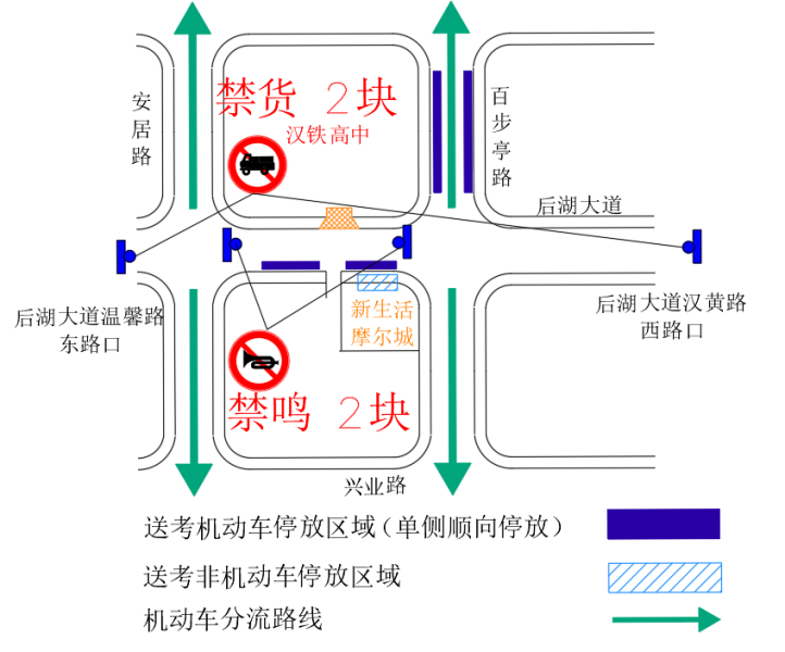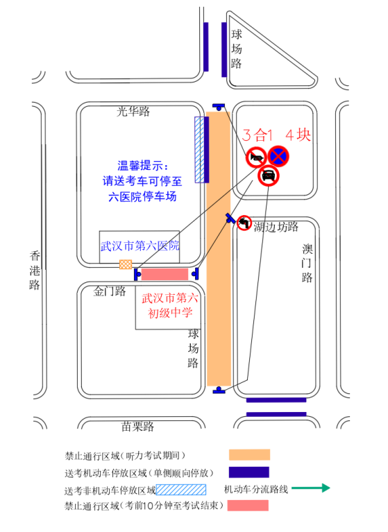 ⛔ 考试期间管制路段:后湖大道(安居路至百步亭路)听力期间禁止通行,建议绕行安居路、百步亭路、兴业路、后湖南路。后湖大道塔子湖西路口、后湖大道塔子湖东路口需按指示标牌绕行。