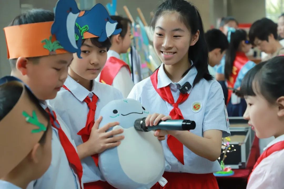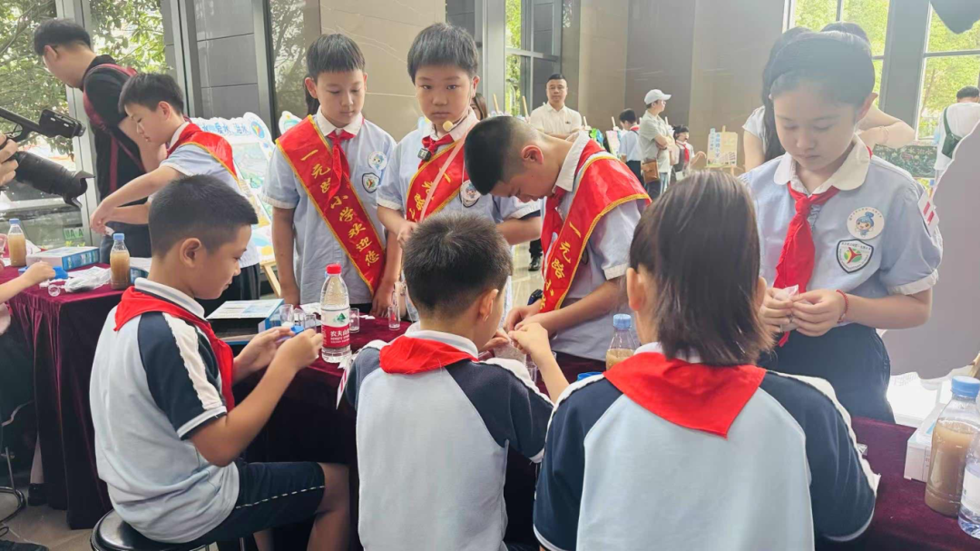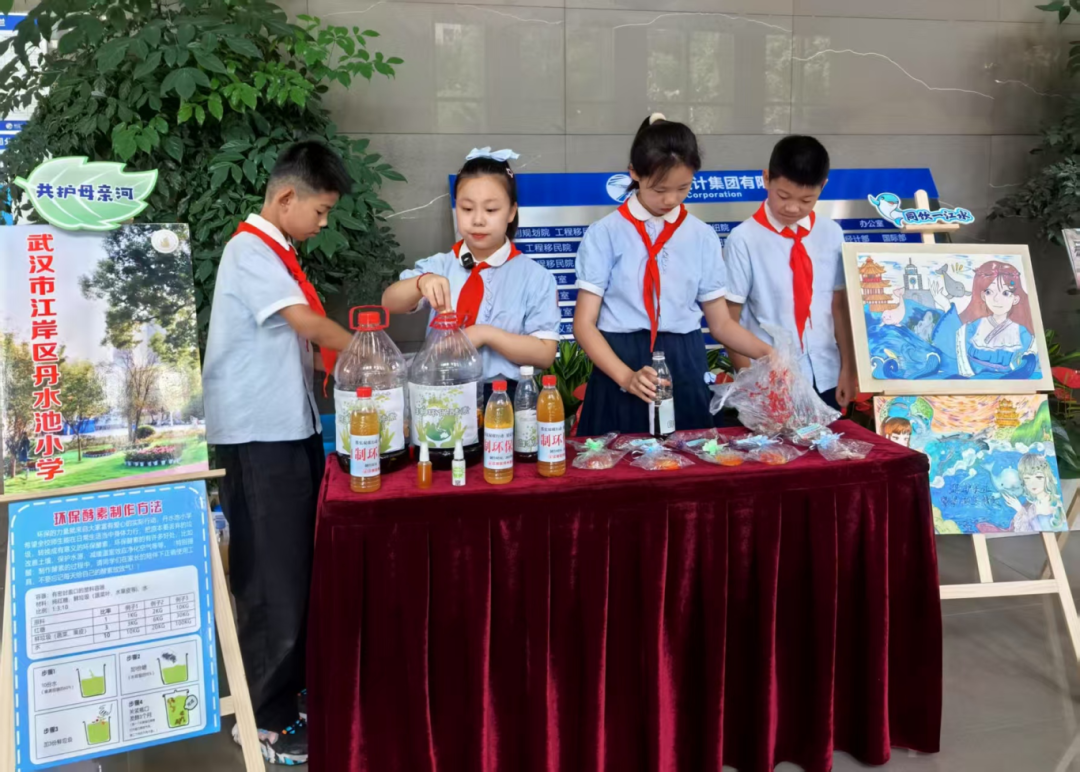 黄陂路小学进行保护长江水质的模拟互动答题。丹水池小学现场制作环保酵素和手工肥皂,展示其在河道治理中的潜在价值,号召源头减污。