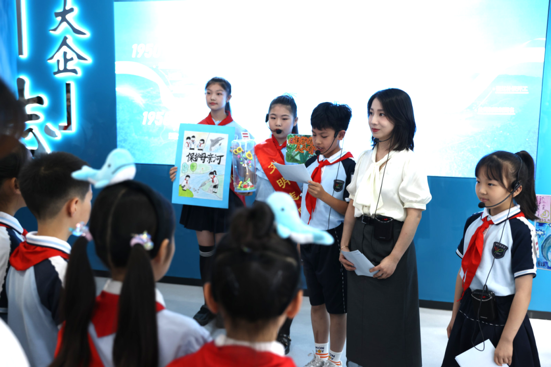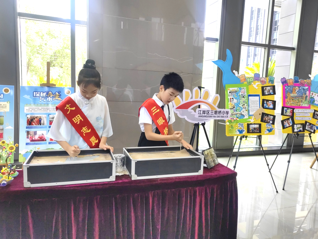 江岸区三眼桥小学的学生们以沙画模型再现黄孝河生态蜕变,展示水质检测多种形式成果,并宣读《给市长的一封信》,誓言守护河流。