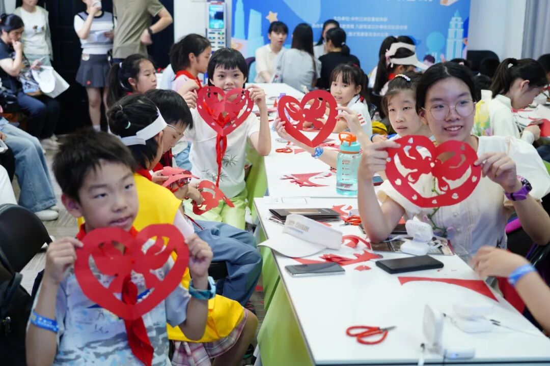 市青少儿剪纸学会副会长林君带来非遗互动,展示了以抗战英雄陈怀民的战斗故事为创作题材的剪纸:其名写于蓝天,云彩飘于天空,双鸽云中飞翔,英雄驾驶战机微笑凝望。这些作品既致敬英雄精神,也让剪纸这项非遗技艺在少年手中得到传承,并焕发出新的生命力。