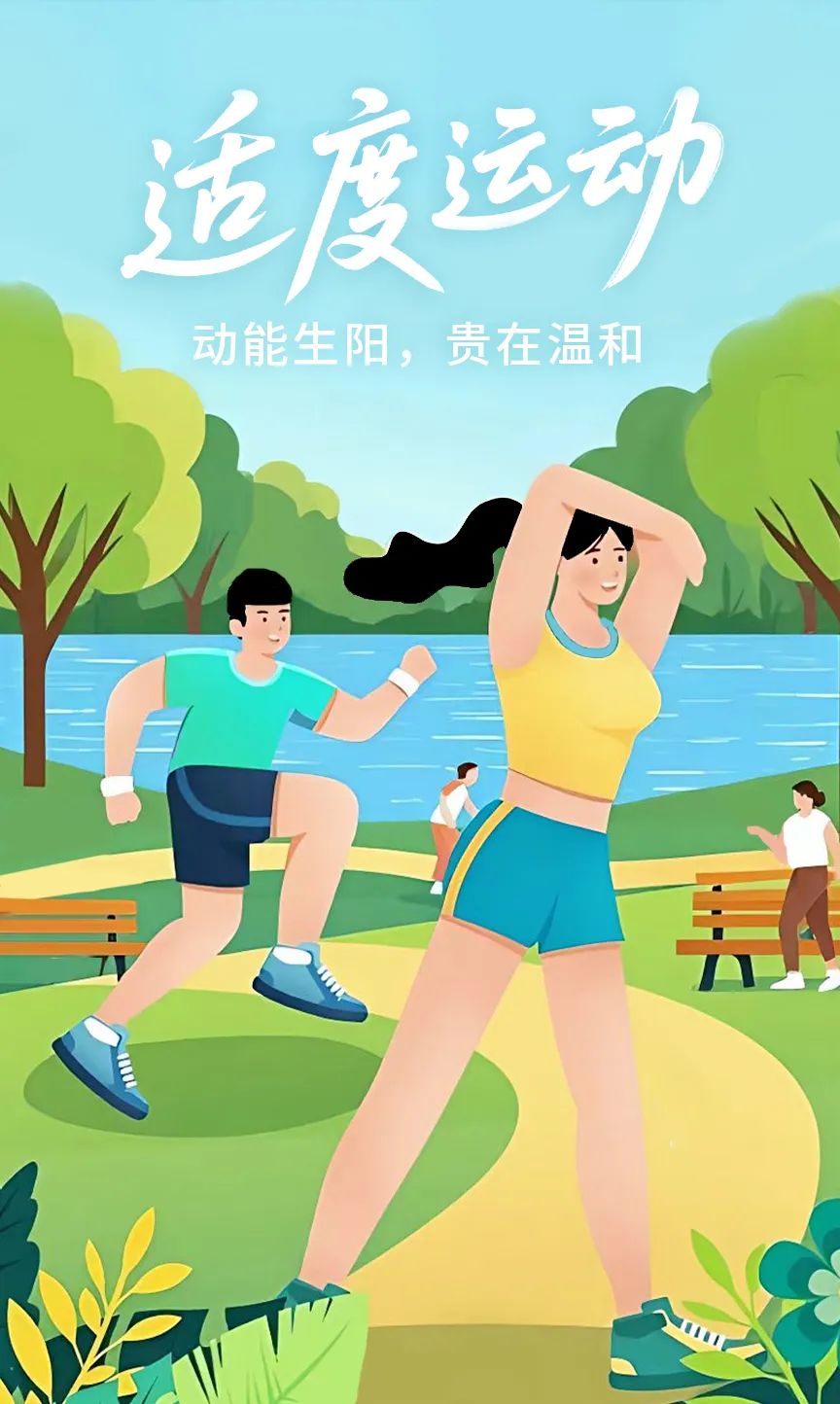 少动多静,选择低强度、温和、不出大汗的方式,在清晨或傍晚凉爽时段进行。