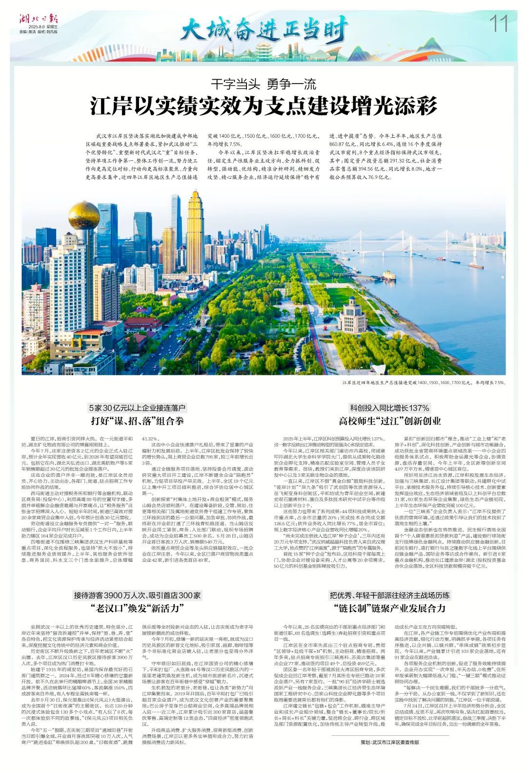 今年以来,江岸区坚决扛牢稳增长政治责任,锚定生产性服务业主攻方向,全力抓科创、促转型,强动能、优结构,精准分析研判、精细发力攻坚、精心服务企业,经济运行延续保持“稳中有进、进中提质”态势。今年上半年,地区生产总值860.87亿元、同比增长6.4%,连续16个季度保持武汉市前列,8个重点经济指标保持武汉市领先,其中:固定资产投资总额291.32亿元,社会消费品零售总额394.56亿元、同比增长8.0%,地方一般公共预算收入76.9亿元。