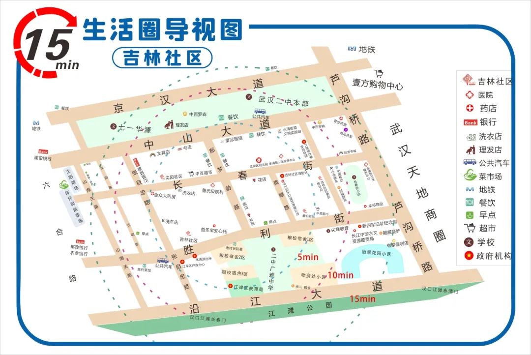 打开吉林社区的生活圈导视图,5分钟、10分钟、15分钟标识格外清晰:从社区中心到中百超市5分钟,到八路军武汉办事处旧址纪念馆10分钟,到汉口江滩公园15分钟。“不用记路,跟着时间走,想要的都能找到。”
