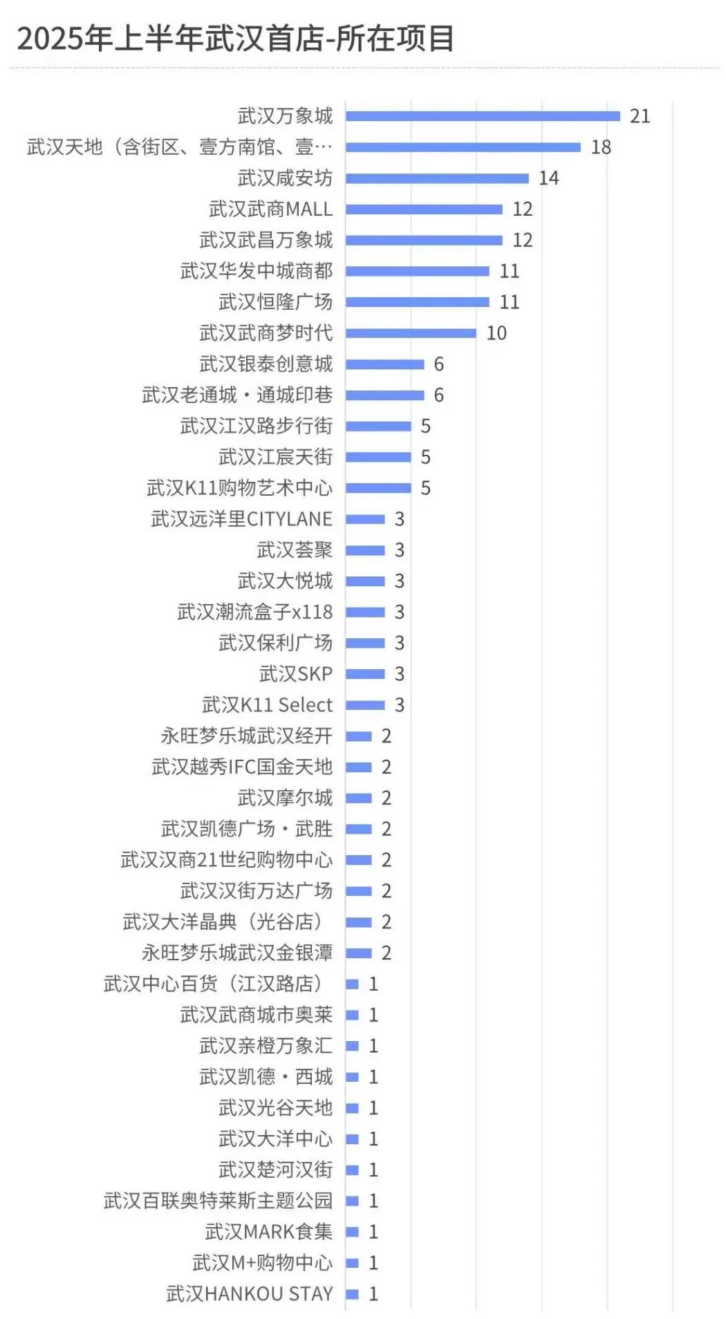这仅是武汉首店经济沸腾图景的一角。近日根据赢商大数据发布的统计,今年1-6月,武汉重点商业载体新开首店184家,同比增长27%,创历史新高。其中,江岸区表现尤为亮眼,武汉万象城、武汉天地、咸安坊三大商圈包揽全市首店数量前三名,独占全市近三成首店资源。