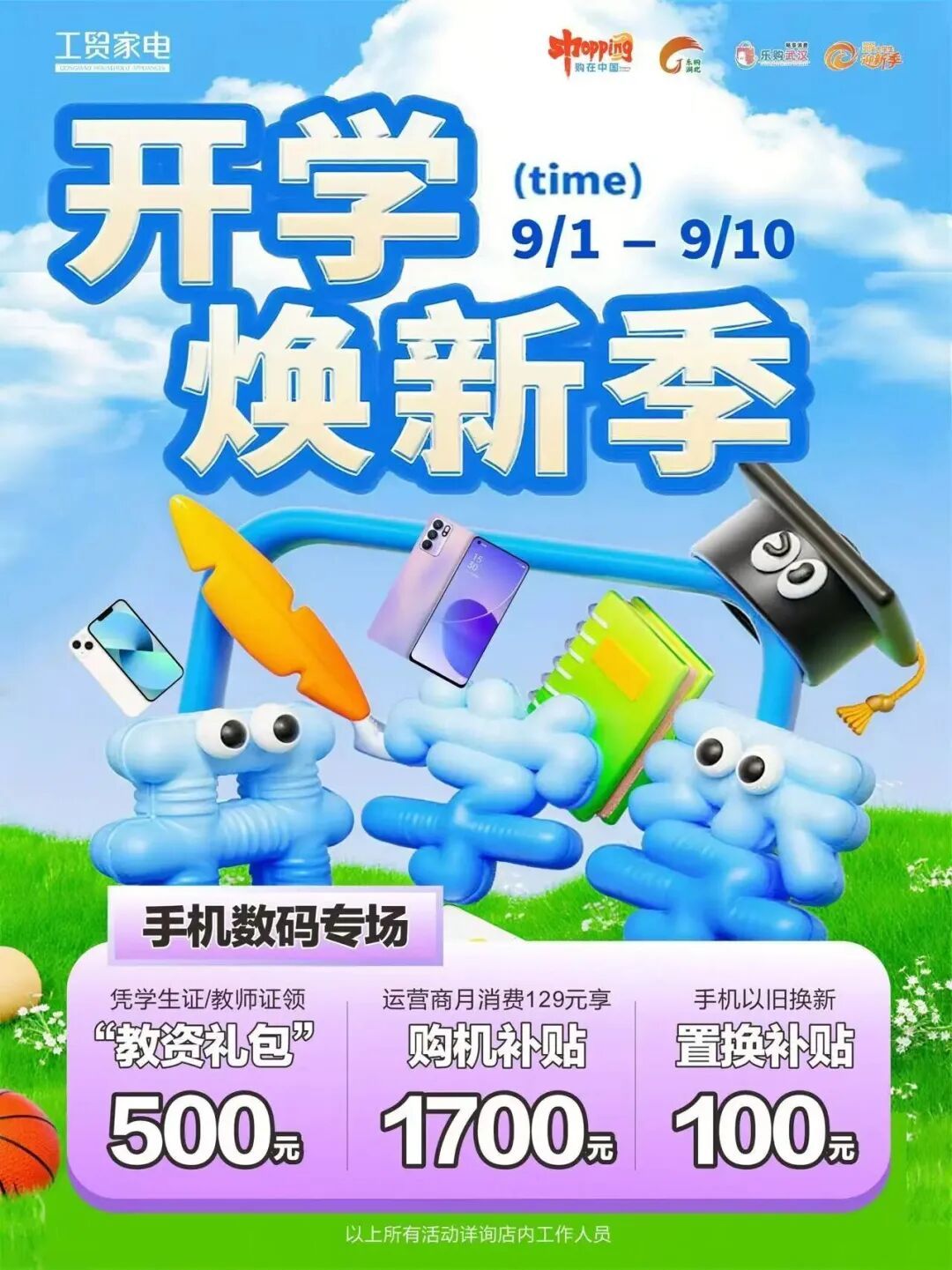 汉口城市广场工贸家电即日起至9月10日推出迎新季手机数码专场。凭学生证或教师证就能领500元教资礼包!优惠福利多多,快去门店咨询一下吧~