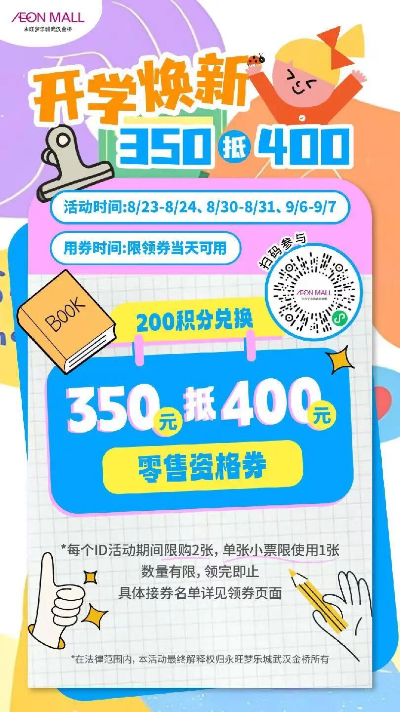 这个周末,永旺梦乐城武汉金桥店开启“玩转秋日 快乐出发”活动,登录商场会员小程序,200积分即可兑换350元代400元零售资格券。
