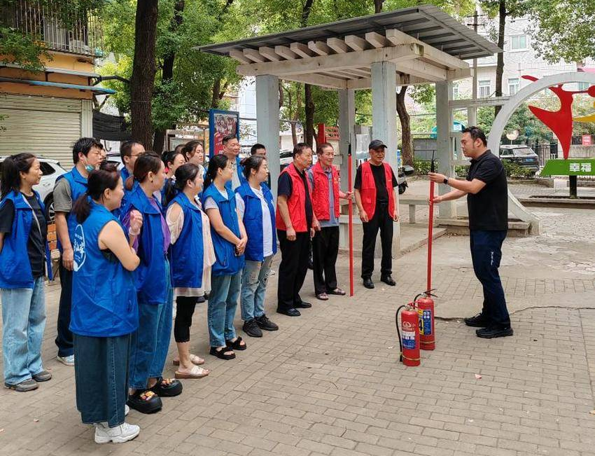 二七街道在花北小区开展消防演练活动,通过教授消防长钩与灭火器操作要领、组织居民实战演练,以“学练结合”的方式提升居民消防安全意识。