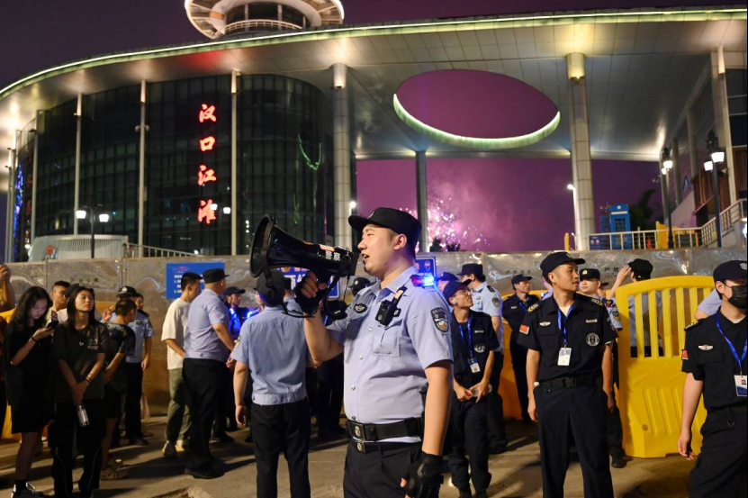 汉口江滩沿线随处可见身着警服的蔚蓝身影,重要路口设置了醒目的指示牌,与民警的指挥交相呼应。江岸公安设立了调度指挥、技术支撑、交通保障等多个工作小组,执勤民警统一佩戴肩灯、手电筒,使用大功率扩音器开展疏导安保。在汉口江滩各个闸口和沿途多个重要路口,采取“分波次放行”科学管控引导,让活动现场平安有序。