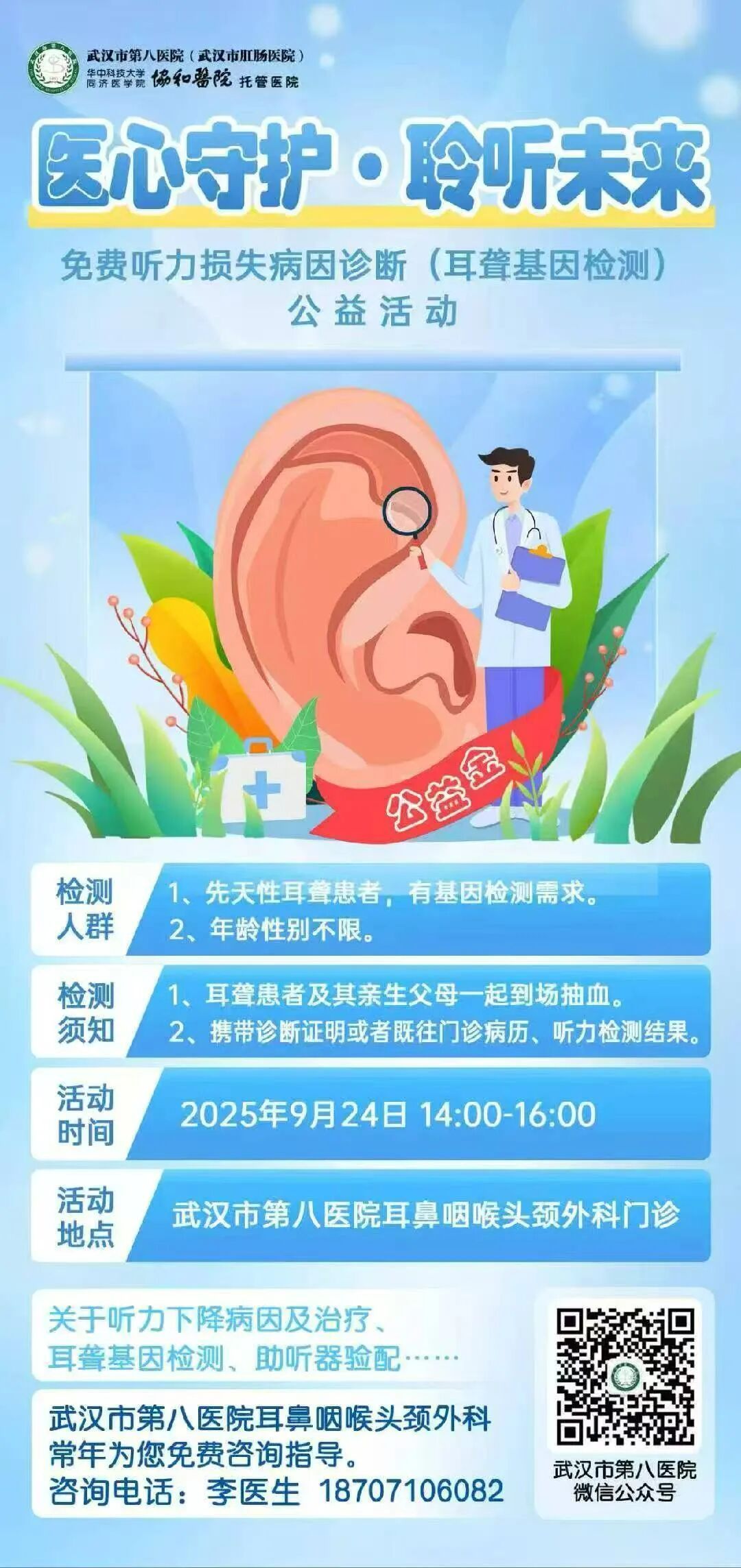 武汉市第八医院(武汉市肛肠医院)将于9月24日14:00—16:00开展免费耳聋基因检测公益活动,先天性耳聋患者携父母带病历一起到场抽血即可参加,不限年龄性别。医院耳鼻咽喉头颈外科门诊常年提供免费咨询指导。
