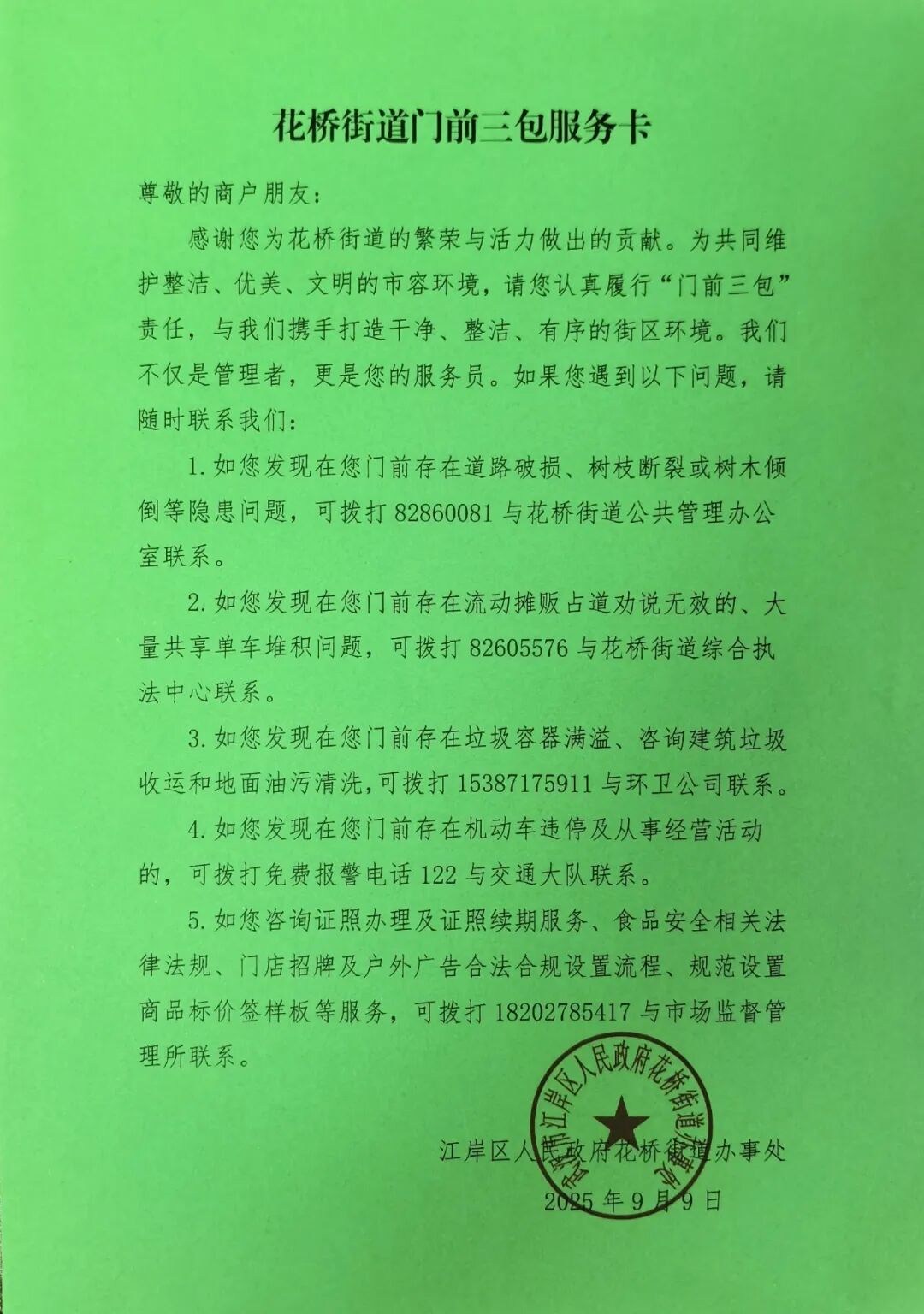 “我们不仅是管理者,更是您的服务员。有问题,随时找我们!”近日,花桥街道向沿街商户发放的“门前三包服务卡”,成了商户们的贴心卡。