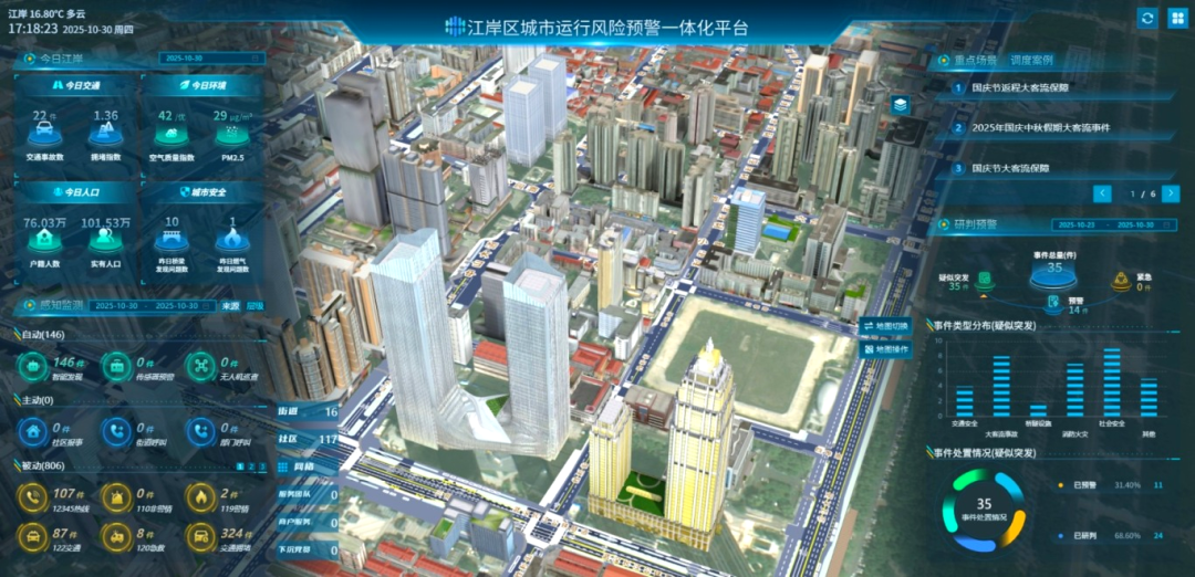 作为第一批国家智慧城市试点城区,江岸区在科学化、精细化、智能化“三化”上勤下功夫。2024年底,江岸区作为全市“一网统管”试点区,率先完成“市建区用”城运一体化平台的部署与应用,标志着城区治理迈入系统化、智能化新阶段。平台汇聚12类72项1.93亿条数据,构建了涵盖楼宇、道路、桥梁、河流、公共设施等为一体的三维数字孪生模型,实现城区运行态势的“全域感知、立体呈现”。