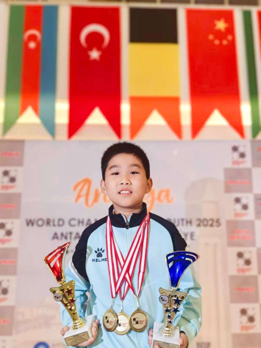 近日,从土耳其安塔利亚传来捷报,在刚刚落幕的2025年世界青少年国际跳棋锦标赛上,来自江岸区一元路小学的8岁学生辛梓玄表现惊艳,一人包揽了男子U8组常规赛、快棋赛和超快棋赛三项世界冠军,成为“三冠王”。