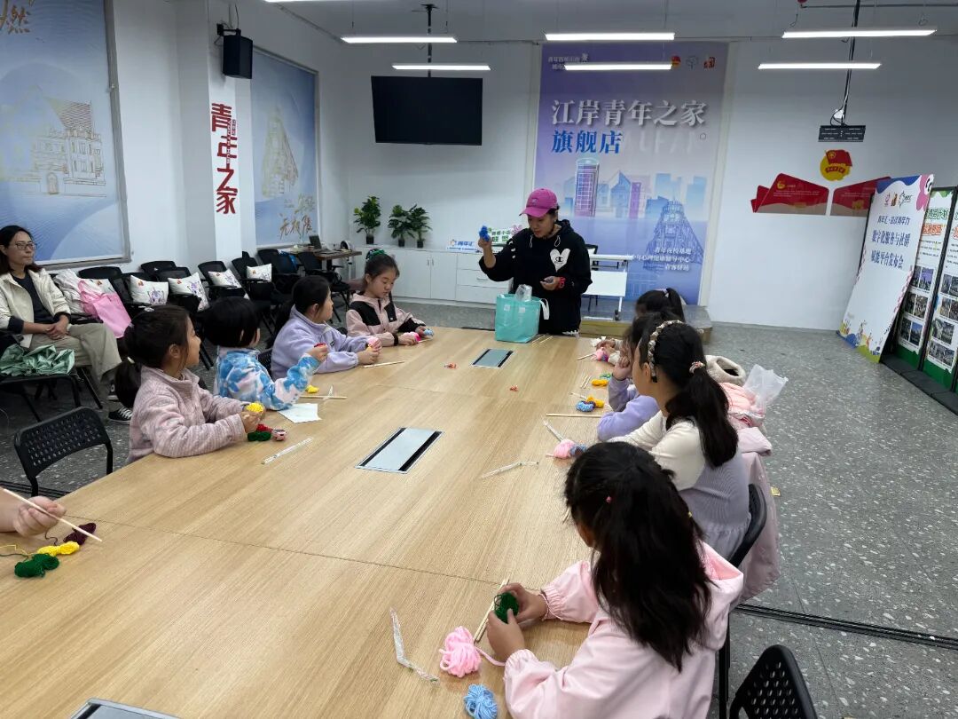 团区委在江岸青年之家开展非遗钩针“毛线曼达拉”解压亲子活动。20组青少年家庭在老师的指导下协作编织作品,通过手作体验释放压力,建立亲子沟通的桥梁。