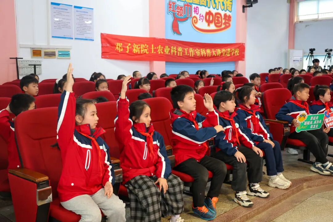 讲座结束后,同学们意犹未尽,踊跃提问:“一株油菜花能榨多少油?”“彩色油菜花是染色的吗?”“油菜花最适合在什么环境中生长?”……汪教授一一耐心解答,从栽培技术到基因原理,层层拆解,为孩子们打开一扇通往农业科学的窗口。